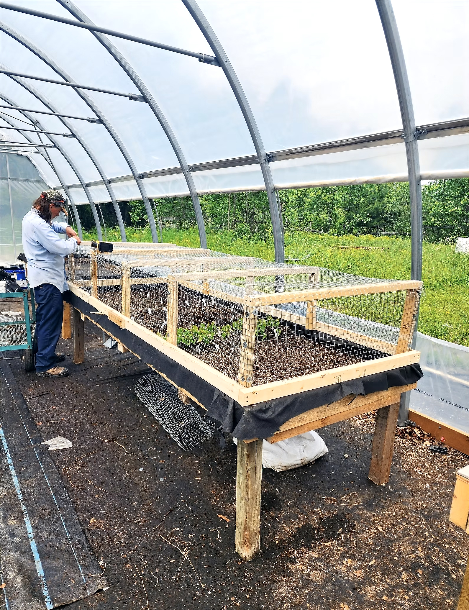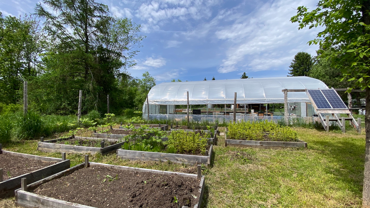 Nous avons également un système de contrôle de l’irrigation (apport d’eau dans les matelas) qui est totalement automatisé et alimenté par des panneaux solaires. Dans les faits, ce type de planche de culture ne demande que très peu de travail et de suivi. Une sonde reliée à un ordinateur permet de prendre des lectures régulières du taux d’humidité dans les matelas. Lorsque ce taux descend en dessous de la limite fixée sur l’ordinateur, la valve électronique est actionnée et de l’eau est envoyée dans les matelas. Ceci permet de réduire les impacts sur l’environnement et les interventions de notre équipe pour le fonctionnement de la pépinière.